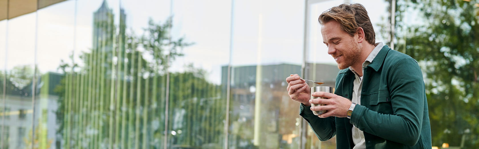 Der Thermo Lunchpot 'Ellipse' von Mepal hält dank der doppelwandigen Isolierung die morgens eingefüllte Suppe Nachmittags immer noch warm. Der Müslibecher To Go hat zwei separate Behälter, in denen sich z.B. Joghurt und Müsli getrennt voneinander transportieren lassen.