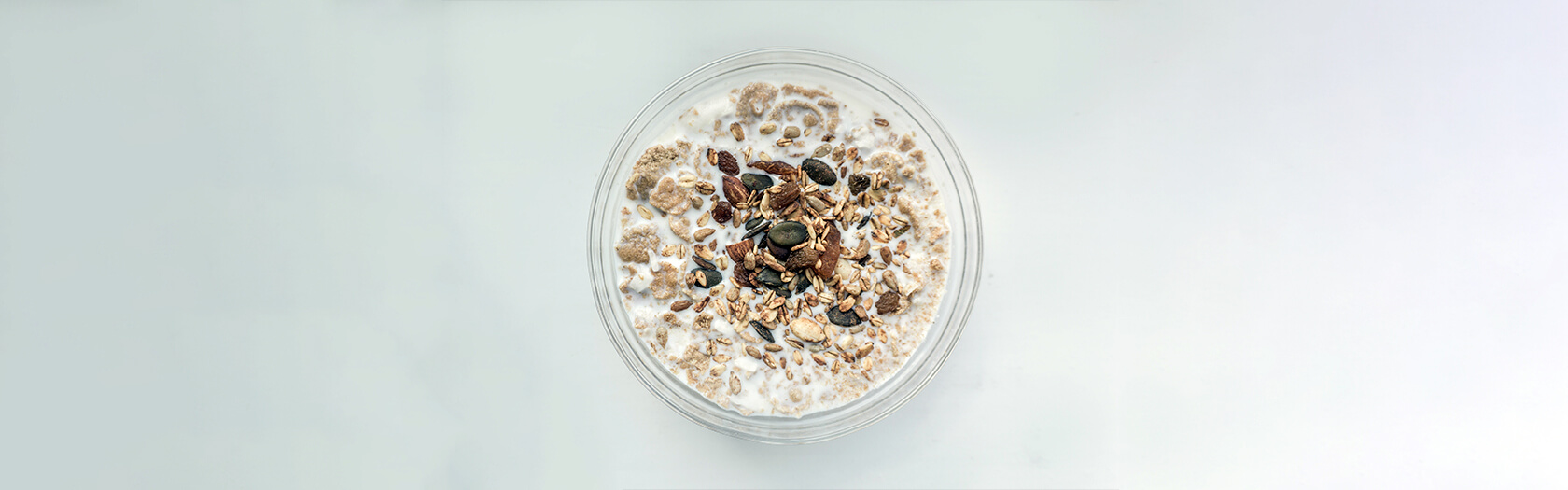 Großer, mehrteiliger Bio Müsli To Go Kunststoffbecher mit Abteilungen für Cerealien, Joghurt oder Snacks mit Basis-Becher und eingesetzem Frische-Container. Der Becher ist frei von Schadstoffen und zu 100% recycelbar.