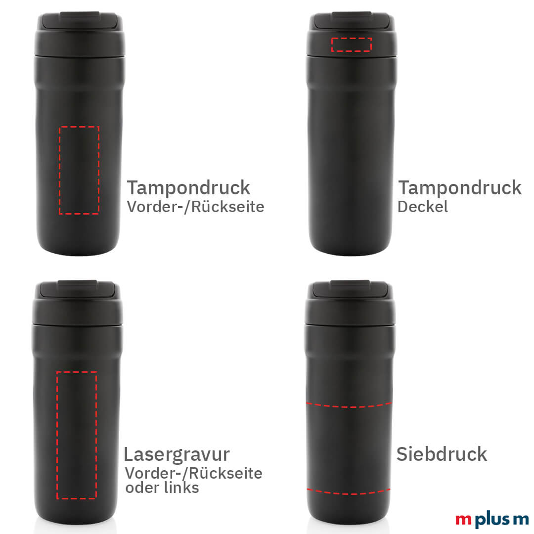 Ab einer Menge von 25 Stück können Sie die Edelstahlflasche bedrucken lassen. Mit Logo Druck wird die Flasche zu einem hochwertigen Werbeartikel und ist perfekt für die Mitarbeiterauststattung.