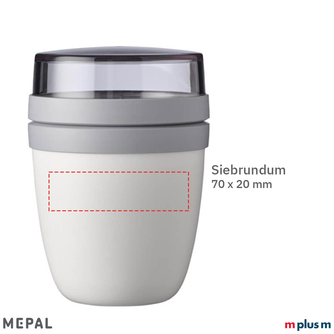 Der Mepal Lunchpot 'Ellipse' ist der perfekte Begleiter für das Essen To Go. Der Behälter hat zwei Teile. Durch eine Drehbewegung lassen sich die beiden Teile voneinander trennen. Der Inhalt des oberen, transparenten Behälters beträgt 120 ml, d. h. dort ist Platz für ca. 50 g Müsli oder Obst. Der Inhalt des unteren Behälters bietet mit 300 ml genug Platz für eine Portion Suppe, Nudeln oder Joghurt. Ein qualitativ hochwertiges Produkt. BPA-frei, lebensmittelgeprüft und auslaufsicher. Geeignet für Mikrowelle (außer Deckel) und Gefriertruhe. Mit Logo Druck ein nachhaltiger Werbeartikel 'Made in EU'.