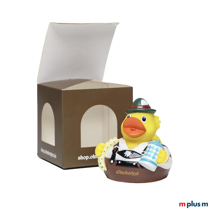 Eine Maß in einem, die Weißwurst im anderen Flügel und einzeln verpackt in einer hochwertigen Geschenkverpackung ist die Quietsche-Ente "Bavaria" das perfekte Andenken und eine bleibende Erinnerung an das schönste und größte Volksfest der Welt!