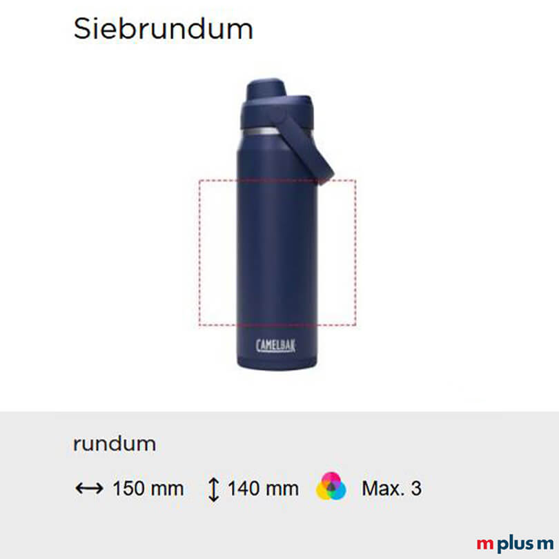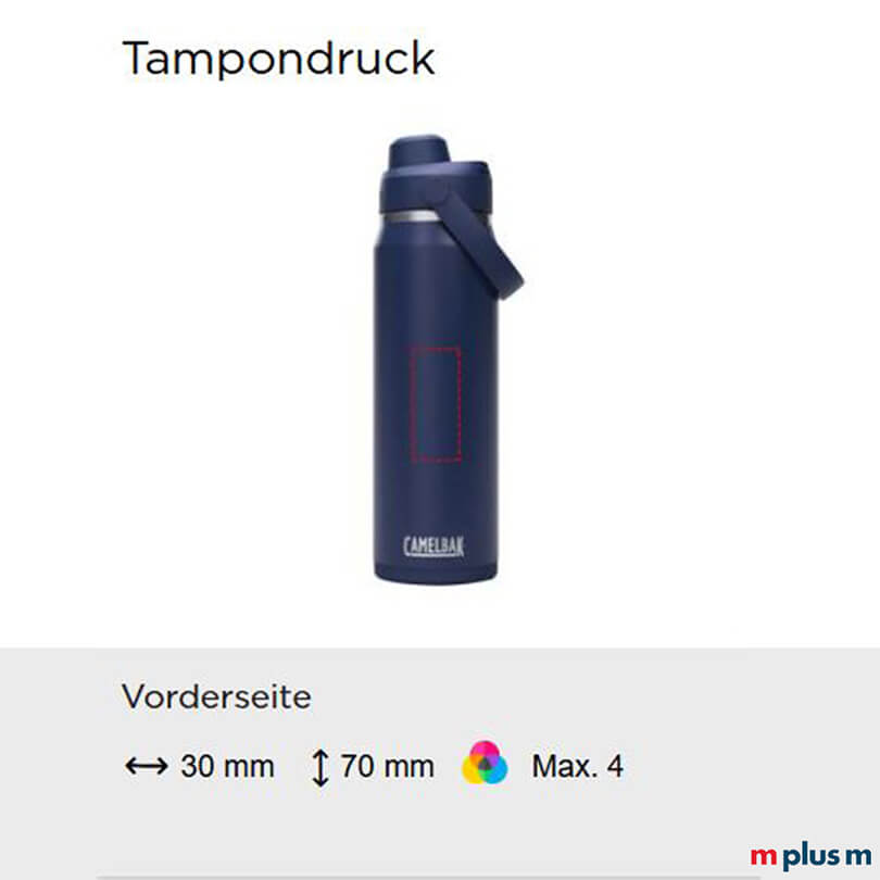 Ab einer Bestellmenge von 10 Stück können Sie die neue Camelbak ISO Thrive Chug Thermosflasche mit Ihrem Logo bedrucken lassen. Sehr schön als Geschenk für Kunden oder Mitarbeiter, als Merch oder Prämie. Folgende Druckmöglichkeiten bestehen: