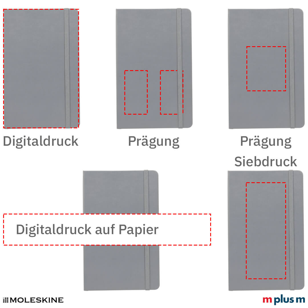 Schon ab einer Bestellmenge von 25 Stück können Sie das Moleskine Notizbuch bedrucken lassen. Dadurch wird das 'Classic Hardcover L' Notizbuch zu Ihrem perfekten Werbeartikel.