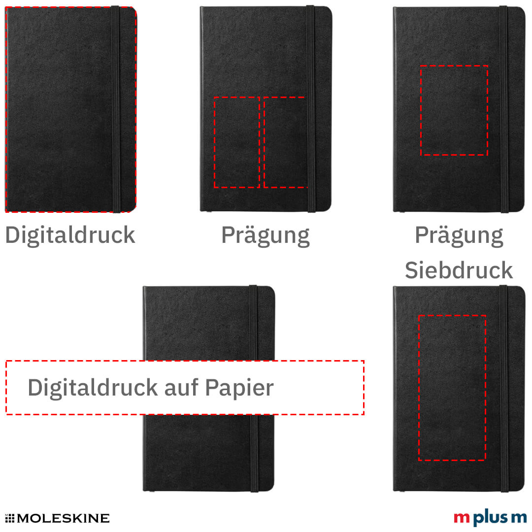 Schon ab einer Bestellmenge von 25 Stück können Sie das Moleskine Notizbuch bedrucken lassen. Dadurch wird es zu Ihrem idealen Werbeartikel. Das Moleskine Notizbuch eignet sich sehr gut als Werbebotschafter Ihres Unternehmens.