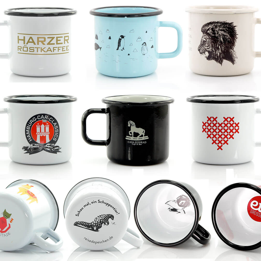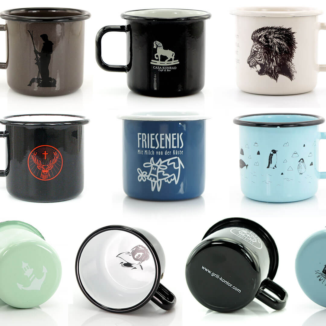 Ihre hochwertige, spülmaschinenfeste Emaille Tasse: Komplett in Europa aus schwerem Metall hergestellt, in Handarbeit dekoriert und gebrannt! Die hochwertige Emaille Tasse 'Helena' wird ab 100 Stück in Ihrer Wunschfarbe glasiert und dann mit Ihrem Logo oder Motiv rundum dekoriert und anschließend eingebrannt. So entsteht ein individuelle Tasse oder ein Becher mit spülmaschinenfestem Logo Druck.