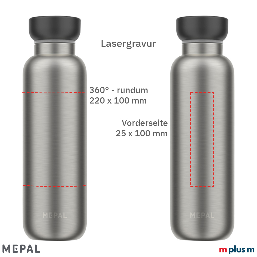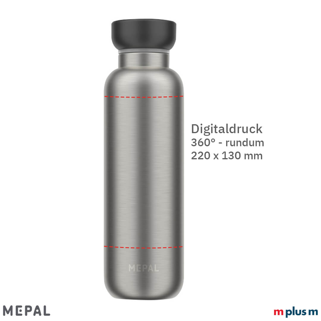 Die Thermosflasche von Mepal ist perfekt für unterwegs. Sie hält Getränke bis zu 12 Stunden warm und bis zu 24 Stunden kalt. Auch kohlensäurehaltige Getränke sind kein Problem für die auslaufsichere Thermosflasche (dann aber die Flasche am besten nicht bis ganz oben füllen). Ab einer Menge von 10 Stück können Sie die Mepal Isolierflasche mit Logo oder Motiv bedrucken lassen.