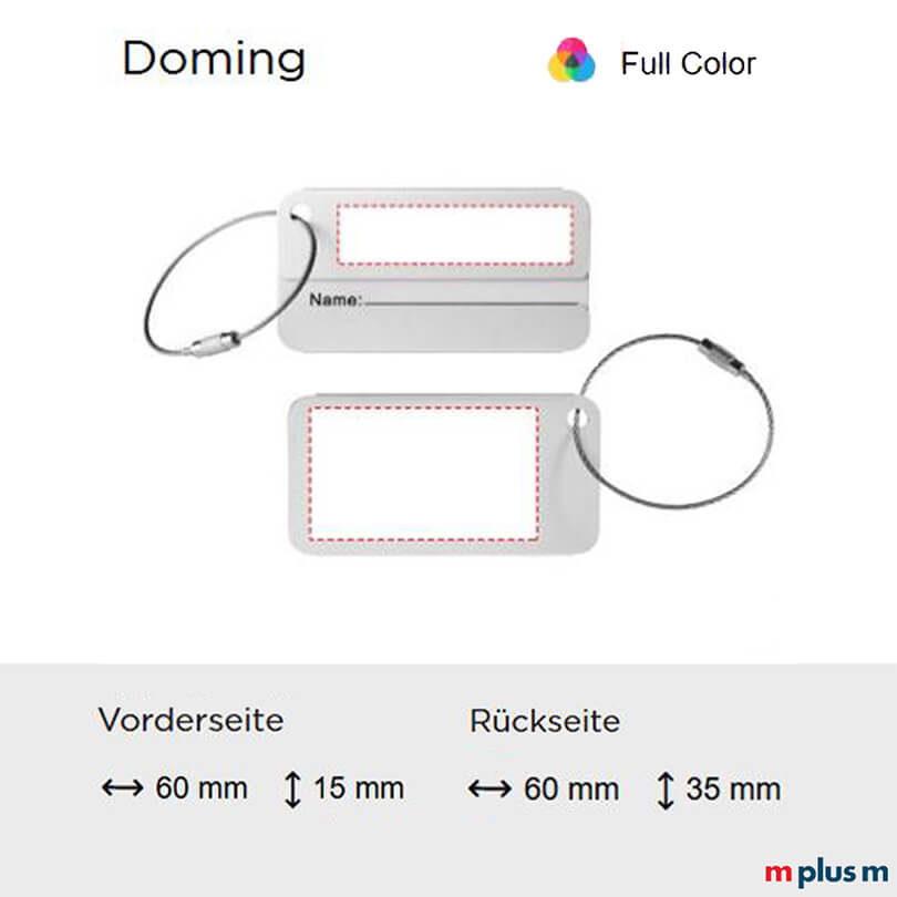 | Doming | Vorderseite / Rückseite | 60 x 15 mm / 60 x 35 mm | vollfarbig |