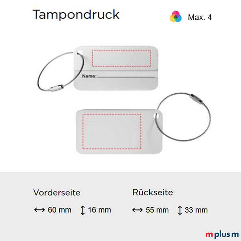 | Tampondruck | Vorderseite / Rückseite | 60 x 16 mm / 55 x 33 mm | max. 4-farbig |