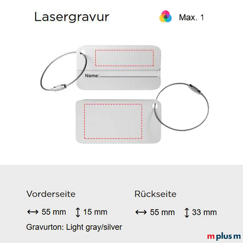 | Lasergravur | Vorderseite / Rückseite | 55 x 15 mm / 55 x 33 mm | einfarbig (hellgrau/silber) |
