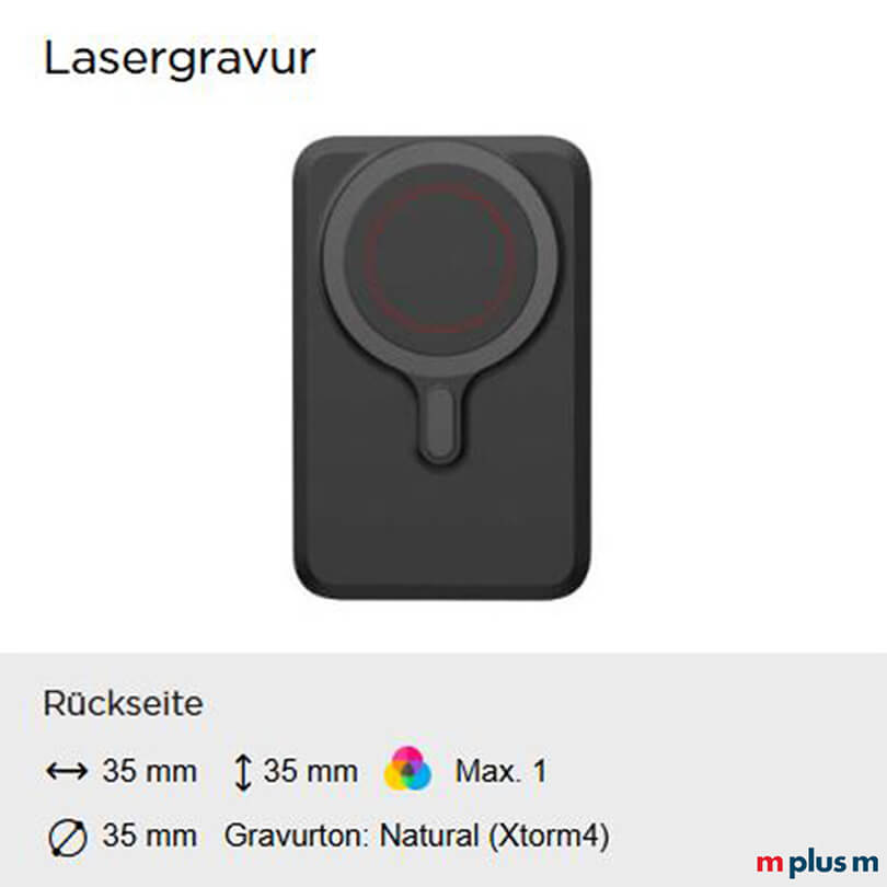 | Lasergravur | Rückseite | Einfarbig (Natural) | 35 x 35 mm |
