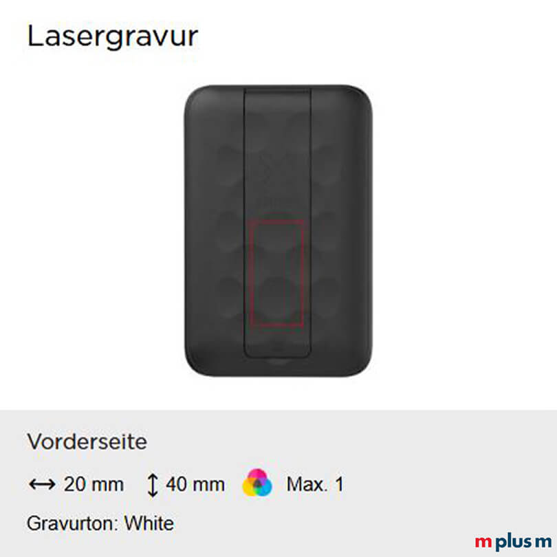 | Lasergravur | Vorderseite | Einfarbig (Weiß) | 20 x 40 mm |
